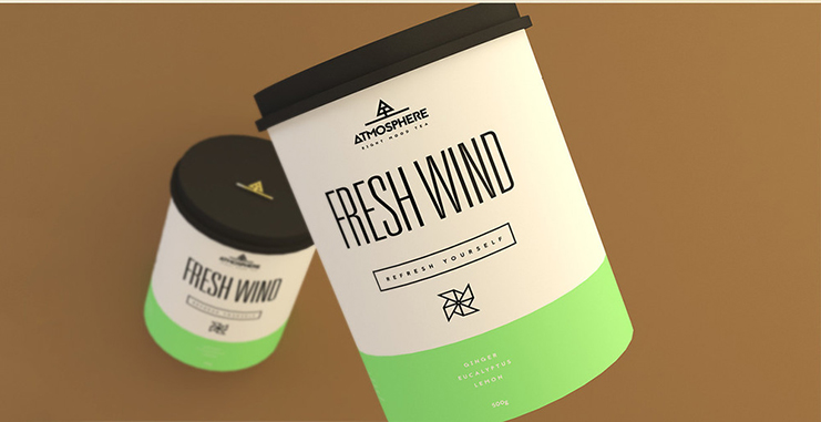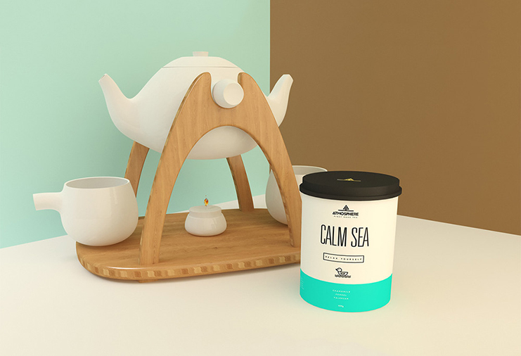 在密閉的圓柱形容器內,保持茶葉內新鮮。每個品種都有一個好名字,意味著它所代表的元素,像“火”和“清新的風”。茶類寫的是一個又高又瘦的無襯線字體,他們都具有代表性的圖標。茶蓋的標志,一個幾何樹站在一個景觀,也看起來像字母“A”的